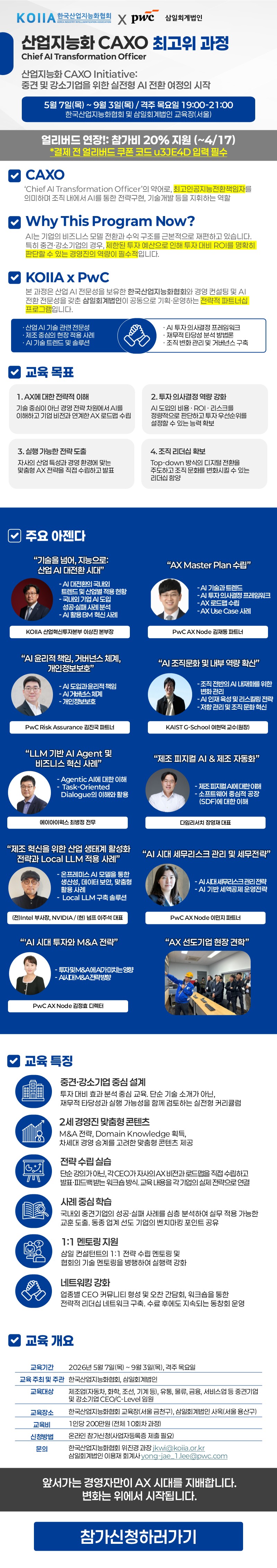 한국산업지능화협회는 삼일회계법인과 함께 CAXO(Chief AI Transformation Officer) 최고위 육성 프로그램을 운영합니다.